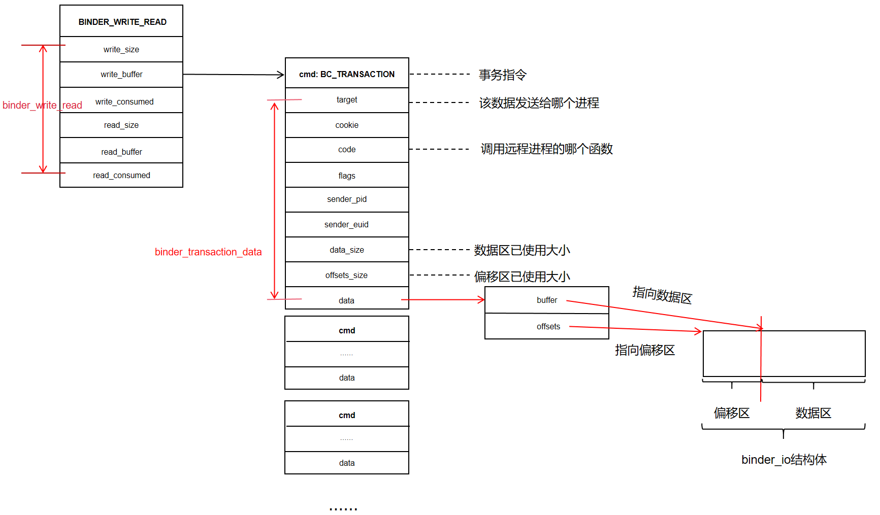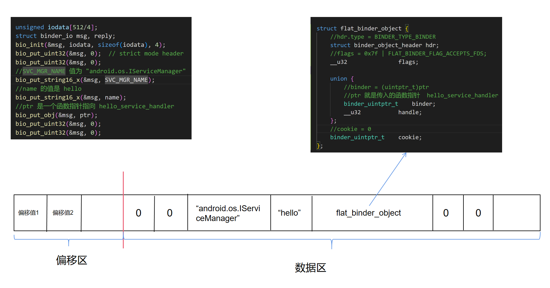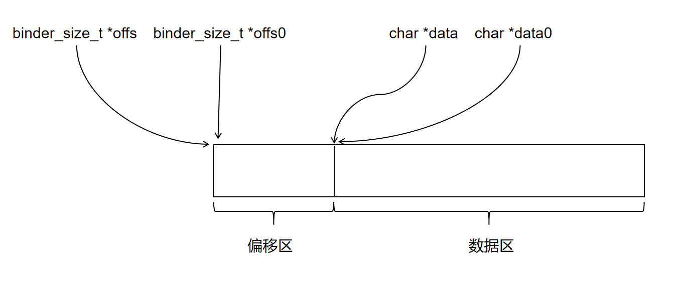 从 binder_io 的定义和初始化过程中可以看出,binder_io 用于管理一块内存,同时将内存分为了两部分管理: